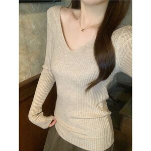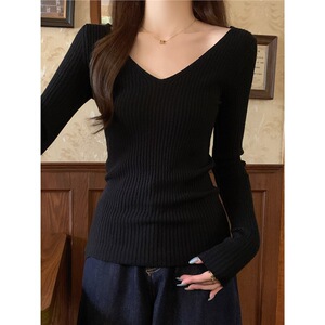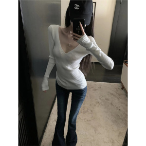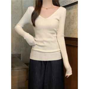 现货miu系白色低V领长袖针织衫女秋季韩系薄款修身坑条内搭打底衫