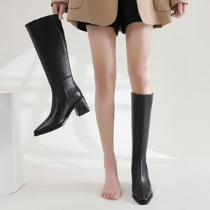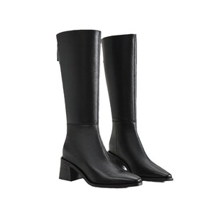 头层牛皮长筒靴女2025冬尖头粗跟加绒骑士靴不过膝粗跟显瘦真皮靴