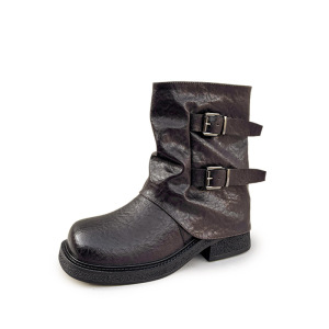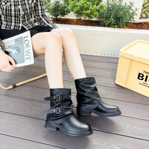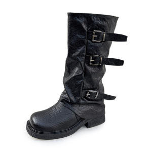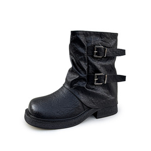 厚底马丁靴女2025秋冬季新款时髦皮带扣短靴方圆头褶皱中筒骑士靴
