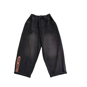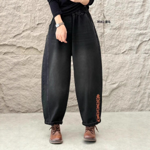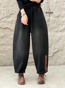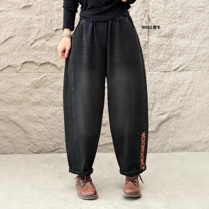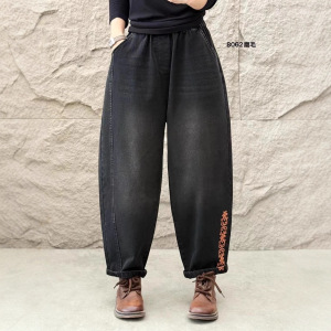 磨毛牛仔哈伦裤女 2025秋冬新款松紧腰复古文艺刺绣宽松大码长裤