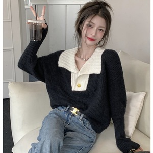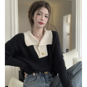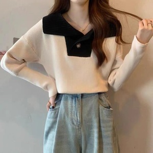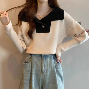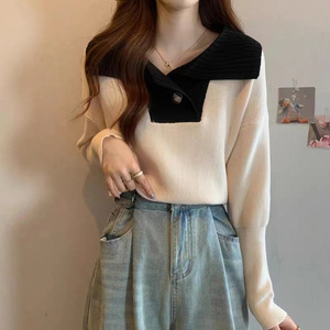 2025早秋韩系撞色慵懒风毛衣时尚版秋冬针织衫小众感宽松上衣