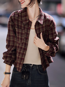 美式复古经典文艺2025年早秋新款时尚格纹磨毛短款长袖衬衫外套女