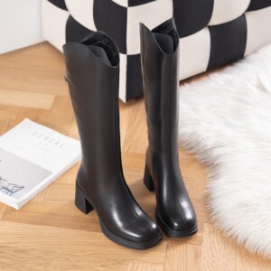 头层牛皮长筒靴女2025秋冬圆头气质加绒不过膝粗高跟显瘦西部皮靴