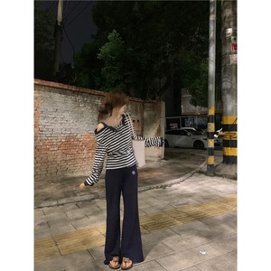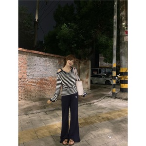原版色织韩系条纹假两件一字肩长袖t恤女秋季宽松慵懒甜辣妹上衣