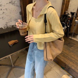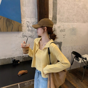 2025超火多巴胺穿搭一整套黄色镂空针织开衫外套吊带上衣两件套装