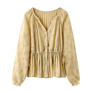 黄色暗纹印花衬衫女2025秋季新款灯笼袖抽绳收腰蕾丝花边上衣