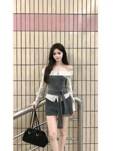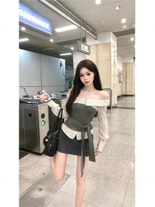 【工厂现货】绑带拼接一字肩长袖衬衫女撞色条纹设计一字肩上衣