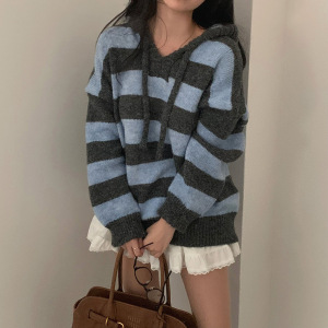 韩国chic秋冬季新款韩版复古条纹连帽宽松慵懒风针织长袖毛衣外套