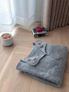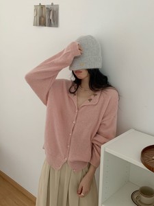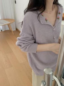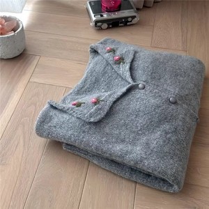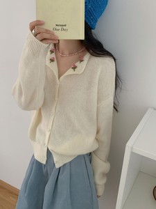 森系甜美风领口手工立体钩花小翻领针织开衫宽松毛衣外套上衣女秋