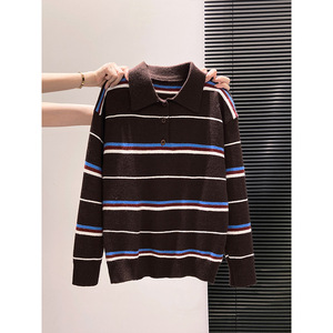 慵懒风条纹POLO翻领毛衣女秋冬宽松长袖上衣休闲学院风针织衫外搭