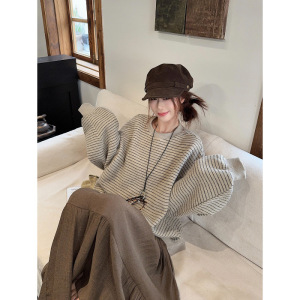 圆领套头无袖长袖慵懒风复古条纹卫衣女新款秋季宽松显瘦休闲上衣