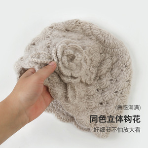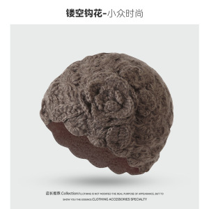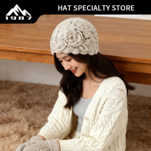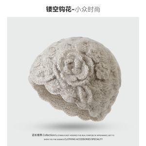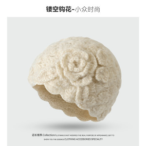 秋冬新款日系镂空立体钩花包头帽女纯色百搭显脸小防寒保暖毛线帽