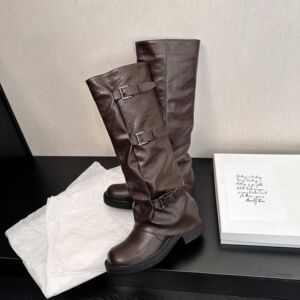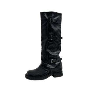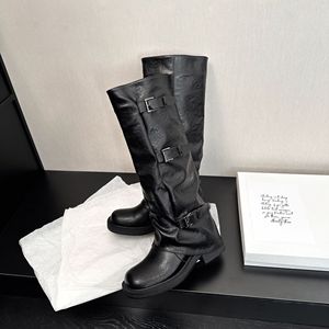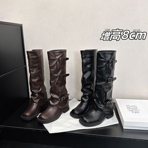 增高8公分皮带扣长筒方圆头骑士靴女2025新款法式褶皱厚底裤管靴