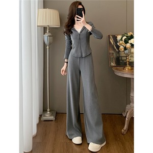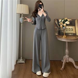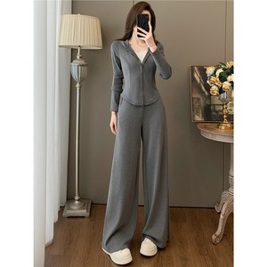 高级感灰色休闲运动套装女2025秋季修身显瘦开衫上衣阔腿裤两件套