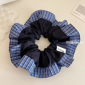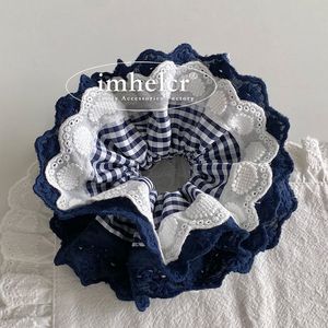 蓝色牛仔格纹花边带标约13cm大肠发圈