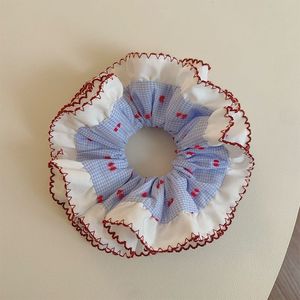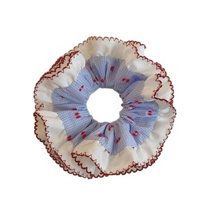 蓝格红线波点撞色花边约16cm双层大肠发圈