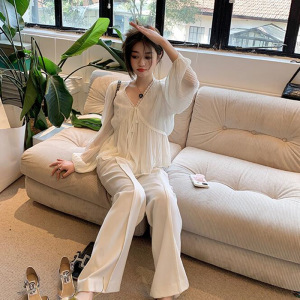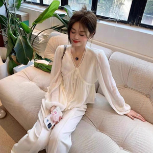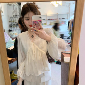 仙气v领蕾丝雪纺衫女2025春秋季新款韩系长袖上衣显瘦气质小衫潮