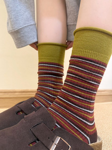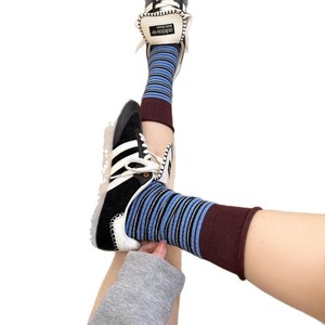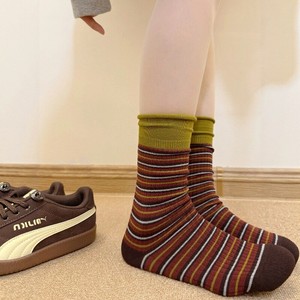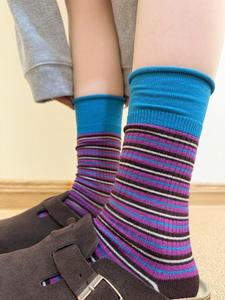 秋冬撞色轻复古条纹中筒袜子女新款流光风复古时尚搭配棉袜堆堆袜