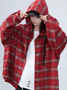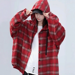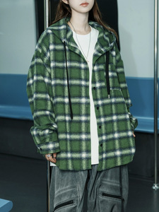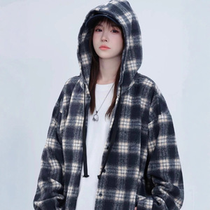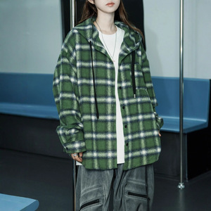 美式格子连帽衬衫外套女秋冬季毛呢磨毛大码宽松休闲长袖慵懒衬衣