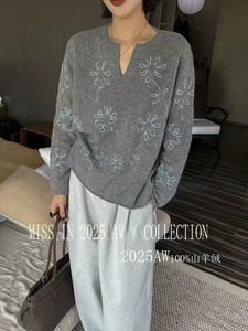 欧货2025早秋新款刺绣花朵针织衫女设计感气质显瘦剪刀领上衣羊毛