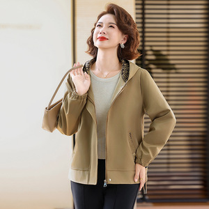 洋气妈妈秋装外套2025新款中老年女装纯色连帽上衣休闲夹克短款