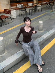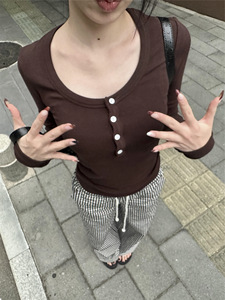 2025甜美风长袖T恤女秋季圆领别致纽扣设计修身显瘦休闲正肩上衣