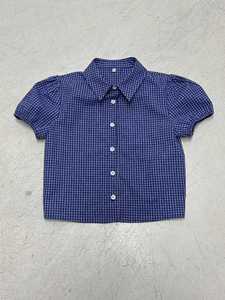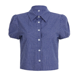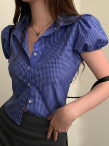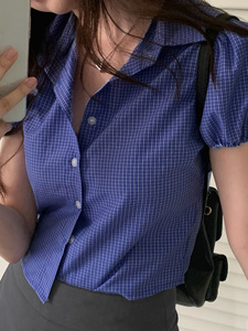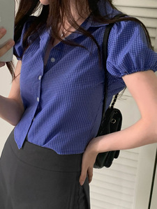 欧美甜美清新风BM格子排口衬衫复古感蓝色翻领修身显瘦短袖上衣