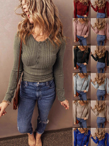 2025秋冬亚马逊wish新款欧美跨境女装纽扣气质纯色长袖T恤上衣女