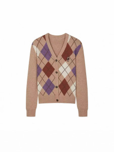 2025年秋季新款复古嵌花菱形格开衫V领卡其色毛衣外套TTCK254901P