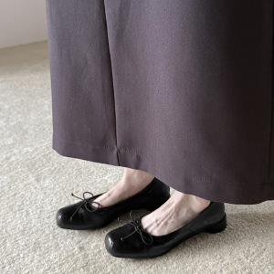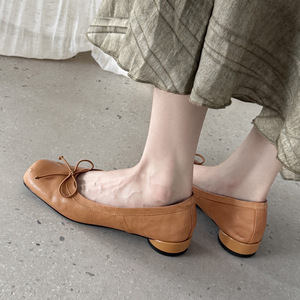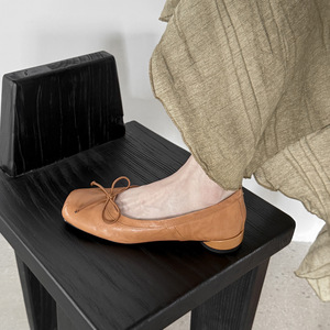 法式复古水洗头层牛皮蝴蝶结2025秋季粗低跟方头全真皮浅口单鞋女
