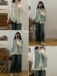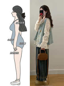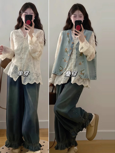 早秋搭配一整套大码胖mm气质镂空显瘦衬衫叠穿马甲牛仔裤三件套女