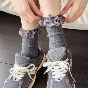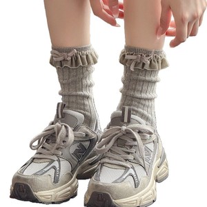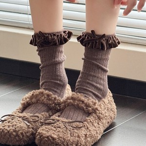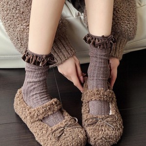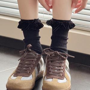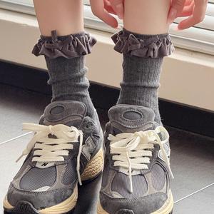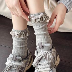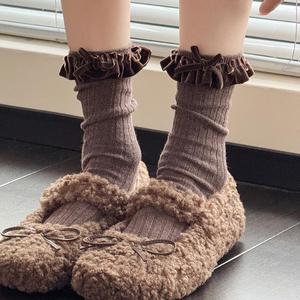 米白色小腿袜女秋冬款复古咖色中筒堆堆袜甜美花边蝴蝶结棉短袜子