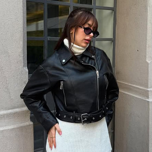 亚马逊欧美时尚复古风气质皮革拉链外套女短款显瘦街头风纯色夹克