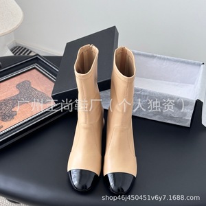 2025秋冬新款小香风真皮圆头珍珠跟短靴女高跟法式弹力中筒靴女靴