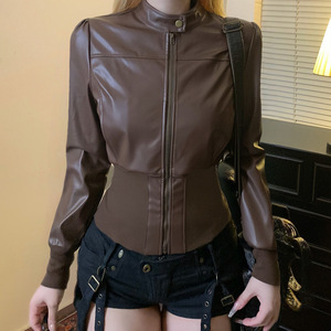 欧美秋冬新品辣妹机车风收腰紧身皮衣街头时尚黑色立领夹克外套女