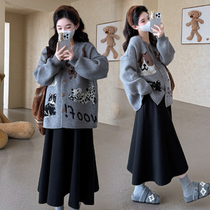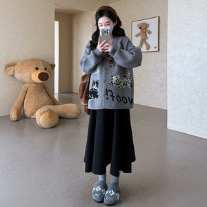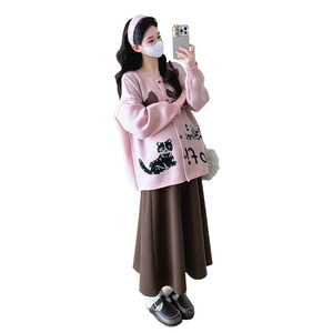 实拍现货2025秋冬卡通猫咪时尚宽松开衫外套+半身裙针织外套