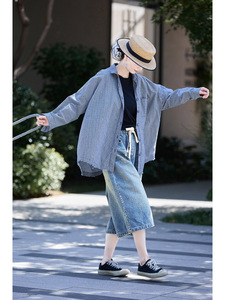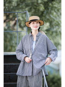 秋季新款文艺复古原创三季款蓝白格子棉宽松百搭清新男友大衬衫女