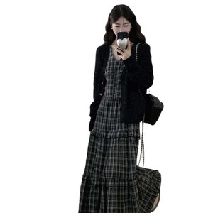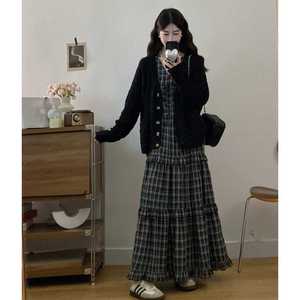 实拍 大码秋冬新款宽松毛衣开衫外套女显瘦格子背心连衣裙套装