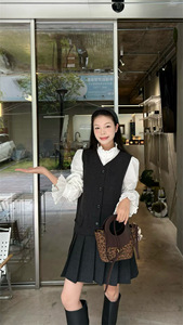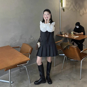 实拍 秋冬韩版法式赫本风荷叶边衬衣+无袖背心百褶连衣裙两件套装