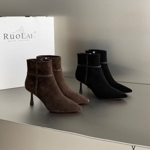 欧洲站女鞋25秋冬时尚软韩国绒布拼羊皮尖头气质侧拉链细高跟短靴
