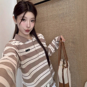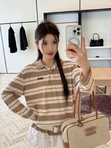 Miu25早秋新款字母徽标拼色翻领POLO百搭宽松条纹长袖情侣上衣潮