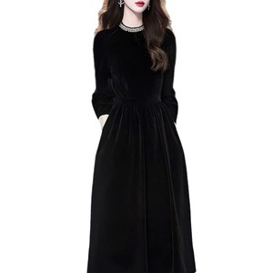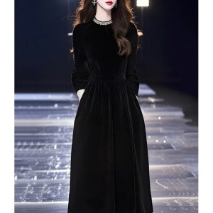 秋季女装重要场合阔太太洋气高贵大方得体的黑色丝绒长袖连衣裙子