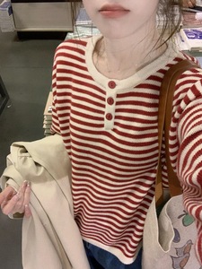 韩系设计感撞条纹圆领羊毛衫女秋冬2025新款小众学院风宽松上衣