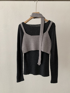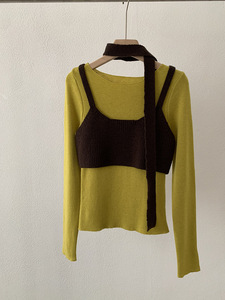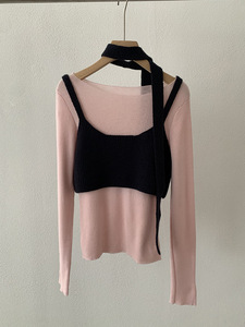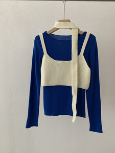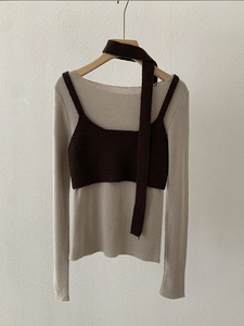 欧玛莱 挂脖飘带长袖打底衫女秋季新款针织背心叠穿二件套潮 4773