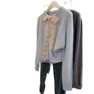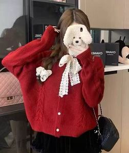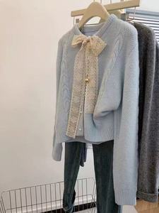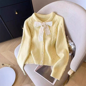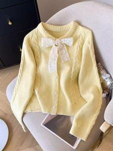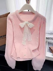 甜美减龄蕾丝蝴蝶结圆领毛衣开衫女秋冬小香风上衣麻花针织外套女
