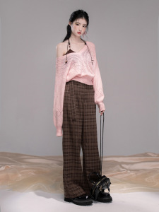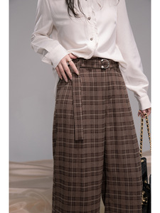 COTRE「古着感格纹」摩卡棕格 格子腰带阔腿休闲裤