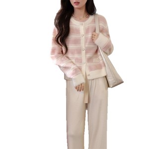 2025秋季新款仿貂绒针织衫开衫上衣慵懒风粉红色条纹软糯毛衣女