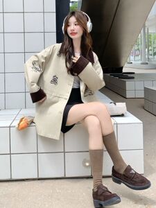 2025秋季韩系撞色灯芯绒拼接翻领风衣外套女宽松复古减龄刺绣外套