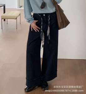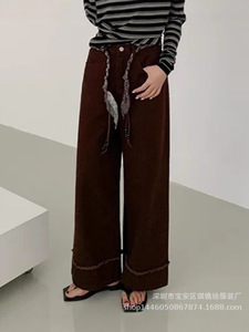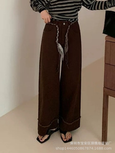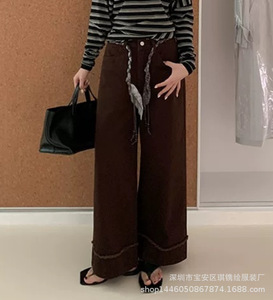 琪镌绘制秋季新款简约直筒显瘦高腰拼接毛边宽松休闲长裤女9986