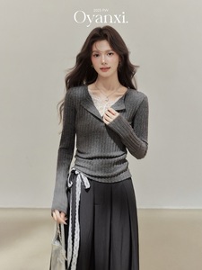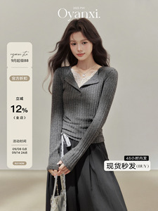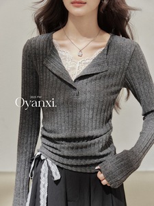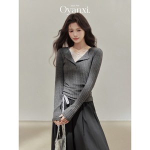 欧阳喜《温柔陷阱》蕾丝假两件V领针织衫女2025新款收腰长袖上衣